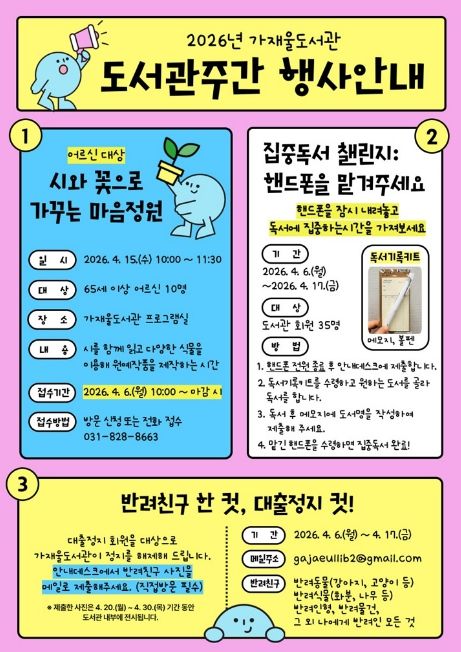 또한 도서관 이용자들의 독서 집중을 돕기 위한 참여형 이벤트 ‘집중독서 챌린지: 핸드폰을 맡겨주세요’를 4월 6일부터 17일까지 운영한다. 참가자는 안내데스크에 휴대전화를 잠시 맡기고 독서 기록 키트를 수령한 후 원하는 책을 골라 독서를 하면 된다.