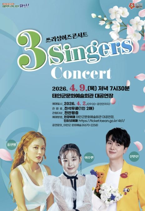 (정도일보) 태안군이 4월 9일 태안군문화예술회관 대공연장에서 홍진영 등 유명 가수가 출연하는 ‘3-Singers 콘서트’를 개최한다.