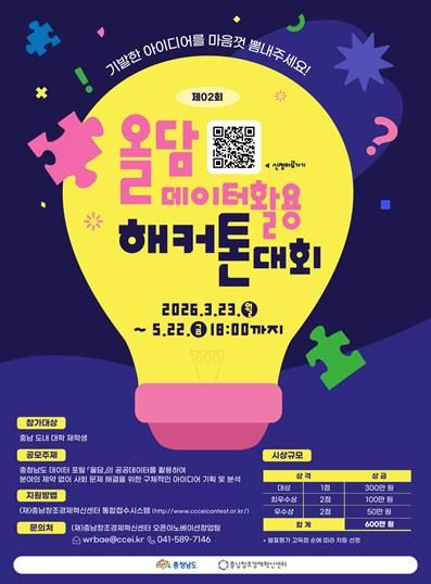 (정도일보) 충남창조경제혁신센터는 충남도내 대학 재학생을 대상으로 공공데이터를 활용한 창의적 아이디어 발굴을 위한 '제2회 올담 데이터 활용 해커톤' 참가자를 오는 5월 22일까지 모집한다고 밝혔다.