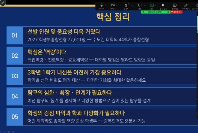 컨설팅은 고등학교 3학년을 대상으로, 좋은일코칭연구소 김병식 대표와 함께 진행했다. 이날 학생들에게 2027학년도 대입 학생부 종합 전형의 특성과 대학 평가 시스템 등을 이해하기 쉽게 설명했다.