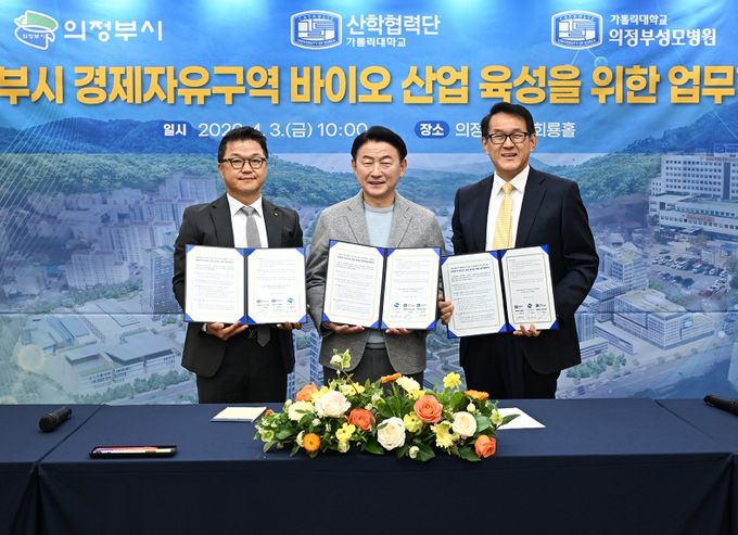 (정도일보) 의정부시는 4월 3일 시청 회룡홀에서 가톨릭대학교 의정부성모병원, 가톨릭대학교 산학협력단과 함께 ‘의정부시 경제자유구역 바이오 산업 육성을 위한 업무협약’을 체결했다.