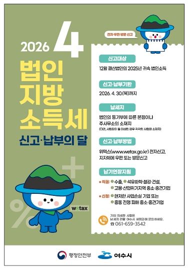 (정도일보) 여수시는 4월 한 달간 ‘2025년 귀속 법인지방소득세에 대한 집중 신고·납부 기간’을 운영한다고 밝혔다.