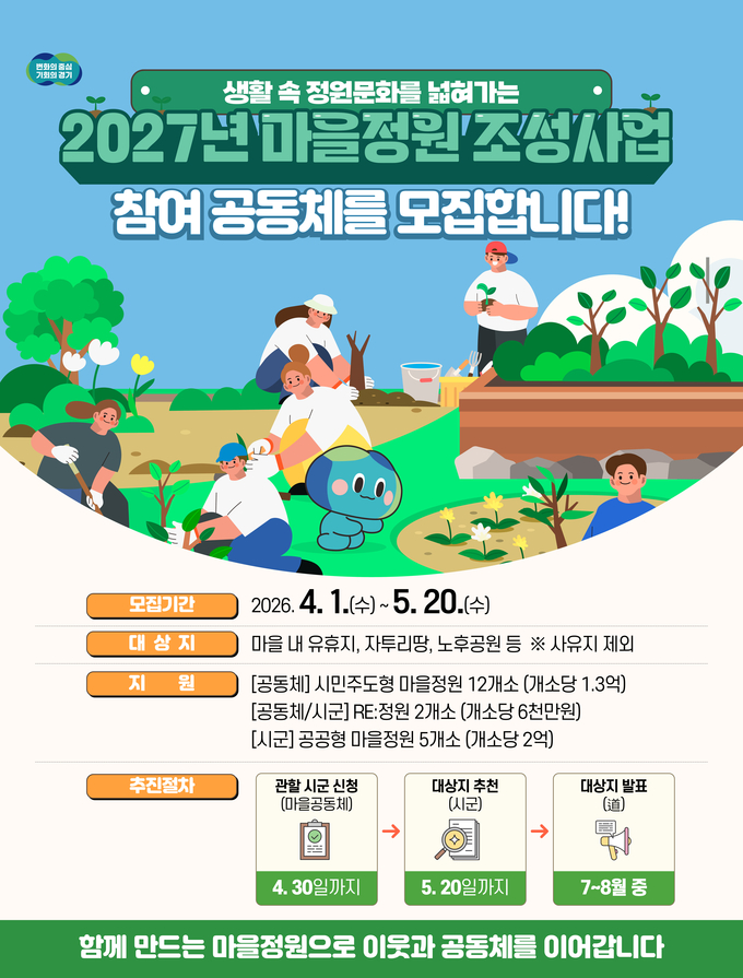 [정도일보 김제영 기자] 경기도는 마을 내 방치된 유휴 공간을 주민이 직접 정원으로 가꾸는 ‘2027년 마을정원 조성사업’ 대상지를 5월 20일까지 공개 모집한다.