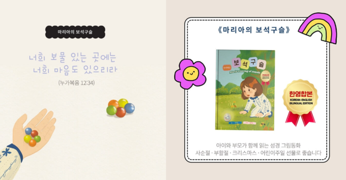 무엇보다 이번 책은 누가복음 12장34절(너희 보물 있는 곳에는 너희 마음도 있으리라) 말씀을 따뜻하게 풀어낸 그림동화로 모든 문장을 한국어-영어로 함께 수록했다.