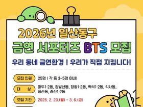(정도일보) 고양특례시 일산동구보건소는 지역 생활환경을 개선하고 간접흡연 없는 건강한 마을을 조성하기 위해 ‘마을 서포터즈 BTS(Best Town Supporters)’를 2월 23일부터 3월 6일까지 모집한다.