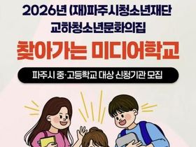 (정도일보) (재)파주시청소년재단 교하청소년문화의집은 파주시 청소년의 미디어 이해력 향상과 디지털 역량 강화를 위해 ‘2026년 찾아가는 미디어학교’ 프로그램에 참여할 중·고등학교를 모집한다고 밝혔다.