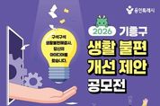 (정도일보) 용인특례시 기흥구는 오는 6일부터 5월 4일까지 ‘2026 기흥구 생활불편개선 제안 공모전’을 개최한다. 이번 공모전은 일상에서 시민이 직접 체감하는 불편사항을 발굴하고, 이를 개선할 수 있는 다양한 방안을 모색하고자 마련됐다. 주제는 일상생활에서 체감하는 생활 불편 개선 아이디어다. 시설·환경 등 각종 생활 불편 사항이나 비효율적인 행정이나 규제 등 다양한 분야의 의견을 받는다. 생활 불편에 관심 있는 누구나 참여할 수 있다. 시 누리집 ‘용인소식’의 ‘고시공고’ 또는 기흥구 누리집 ‘참여광장’의 ‘기흥소식’에서 서식을 내려받아 작성하면 된다. 작성한 제안은 방문‧우편(기흥구 관곡로 95 기흥구청 별관 2층 자치행정과 기획감사팀)으로 내면 된다. 전자우편으로도 제출할 수 있다. 부서 검토와 제안공모심사위원회 검토를 거쳐 최종 선정된 제안은 시상금(최대 100만 원)이 지급된다. 또 관련 부서 검토 등을 거쳐 행정에 반영하거나 실효성 있는 정책으로 이어질 수 있도록 추진할 방침이다. 자세한 사항은 시 또는 구 누리집에서 확인할 수 있다.