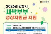 (정도일보) 안성시는 3월 13일'안성시 출산·양육 지원 조례'일부개정을 통해 새싹부부성장지원금 연령 기준(49세이하 신혼부부)을 폐지하여 지원 대상을 확대했다. 이 사업은 신혼부부의 안정적인 생활 기반 마련과 출산 장려를 목적으로 작년 7월 1일부터 시행됐으며, 단기간에 예산이 소진될 만큼 많은 관심을 받았으나 49세 이하로 연령 제한 기준이 있어 다양한 가족 형성 시기를 포용하지 못하는 아쉬움이 있었다. 이에 안성시는 이러한 한계를 보완하고자 연령 기준을 전면 폐지했으며 더 많은 시민이 혜택을 누릴 수 있도록 지원 범위를 확대 했다. 지원금은 1차 성장지원금(결혼)과 2차 성장지원금(출산)으로 구성되어 단계적으로 지급된다. 1차 성장지원금은 2025년 7월 이후 혼인신고를 완료한 부부가 6개월 이내에 신청할 경우, 100만원의 지역화폐가 지급된다. 다만, 부부 중 한 명이 안성시 외 지역에 주소를 두고 있는 경우 혼인신고 후 30일 이내 전입신고를 완료하면 신청할 수 있으며, 49세 이상인 경우 2026. 1. 1. 이후 혼인신고한 부부부터 지원 가능하다. 2차 성장지원금은 1차 지원금을 받은 신혼부부가 1