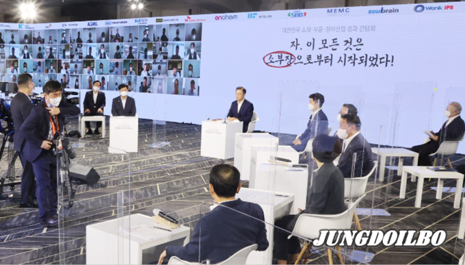 문 대통령은 "‘소부장 자립’의 길을 더 튼튼하게 발전시켜나가야 하는 이유"라며 "그 길에 기업인 여러분이 선두에 서주시기 바란다"면서 정부 지원을 약속했다.