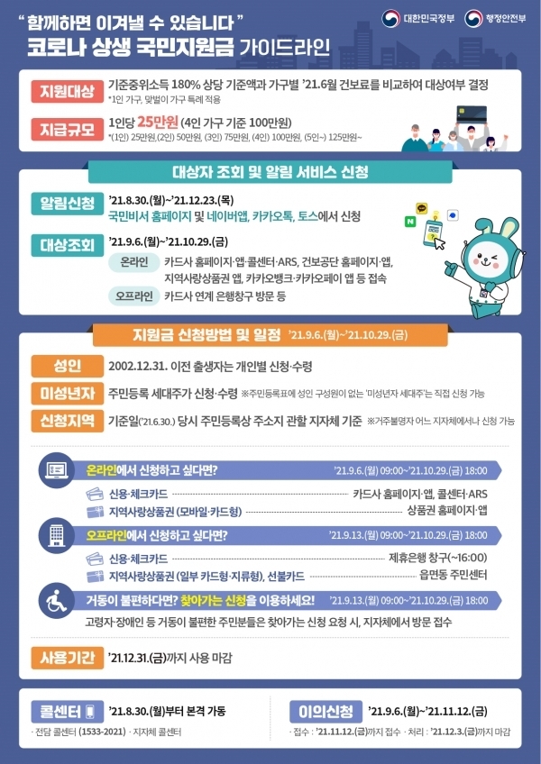 이 밖에 정부는 지급대상자 선정 결과에 이의가 있는 국민을 위해 별도의 이의신청 절차도 운영할 계획이다. 이의신청은 온라인으로도 진행할 수 있고, 지원금 신청이 개시되는 다음 달 6일부터 온라인 국민신문고나 주소지 관할 주민센터에서 접수하면 된다.