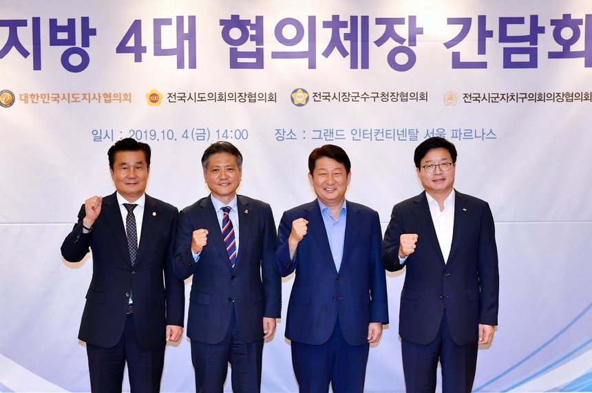 대한민국시·도지사협의회와 전국시·도의회협의회, 전국시장·군수·구청장협의회, 전국시·군·자치구의회의장협의회 등이 참여하는 지방4대 협의체는 4일 오후 2시 그랜드 인터컨티넨탈 서울 파르나스에서 상견례를 갖고 자치분권 입법대응을 약속했다.