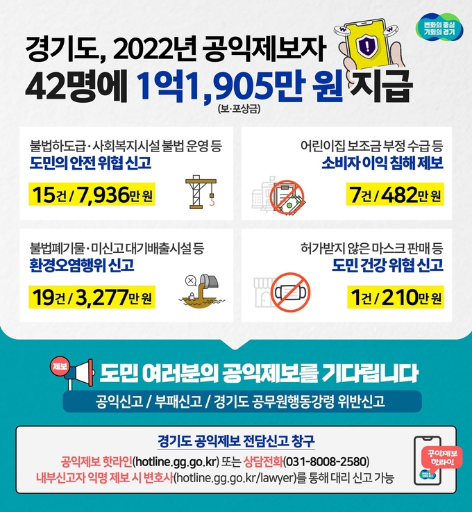 [정도일보 김제영 기자] 경기도는 2022년 한 해 동안 ‘경기도 공익제보 핫라인’ 등을 통해 공익제보를 한 제보자 42명에게 보·포상금 총 1억 1,905만 원을 지급한다고 15일 밝혔다.