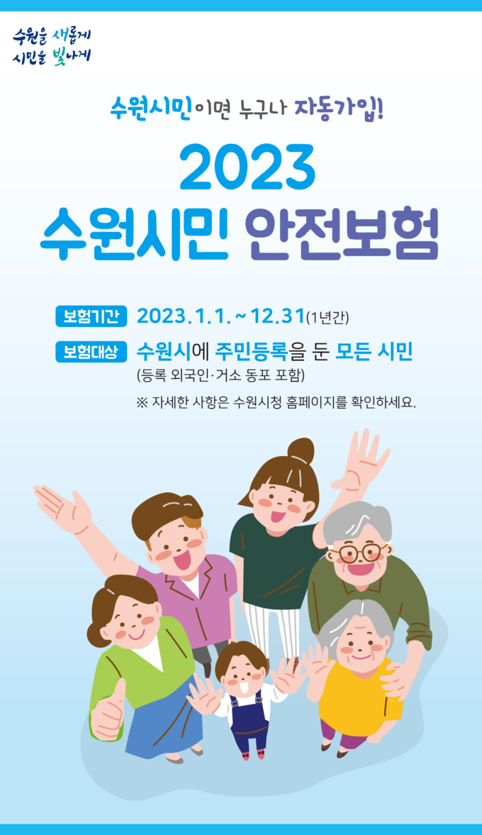 [정도일보 고정희 기자] 수원시가 예기치 못한 화재, 안전사고 등을 당한 수원시민(등록 외국인·거소 동포 포함)에게 보험금을 지급하는 ‘2023년 수원시민 안전보험’에 가입했다. 수원시민은 보험에 자동 가입되고, 보장 기간은 12월 31일까지다.