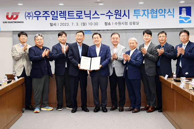 수원시는 3일 시청 상황실에서 우주일렉트로닉스와 ‘본사와 연구소 이전을 위한 투자 협약’을 체결했다.