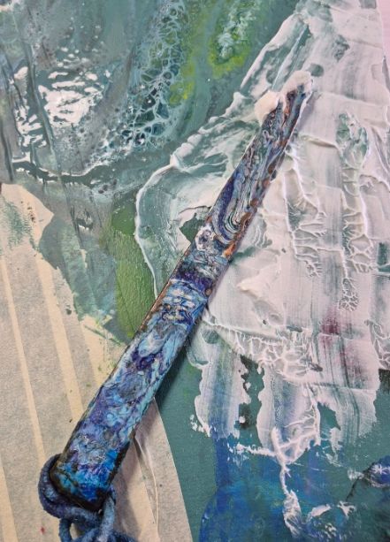 ‘물꽃을 찾아서’는 오리발에 물감을 부어 캔버스에 흘려 바탕을 표현했고, 해녀들이 가져다 준 치마, 커튼, 이불의 꽃을 오려붙여 바다속 꽃밭을 탄생시켰다.
