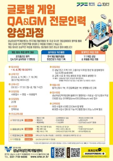 성남여성인력개발센터는 전문적인 게임 QA(게임테스터, Quality Assurance)와 GM(게임운영관리자, Game Master) 직무교육에 참여할 교육훈련생을 4월 4일까지 모집 중이다.