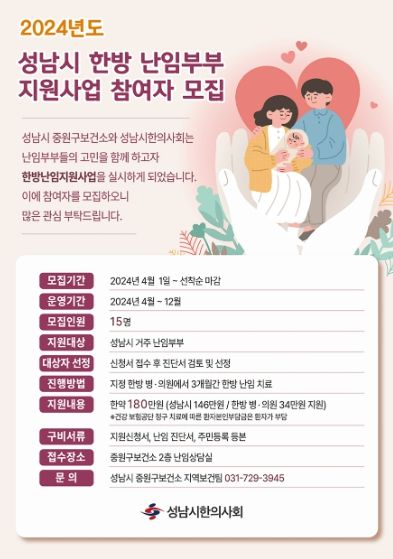 이 사업은 임신이 어려운 난임 부부를 돕기 위해 성남시한의사회와 협업 추진한다.