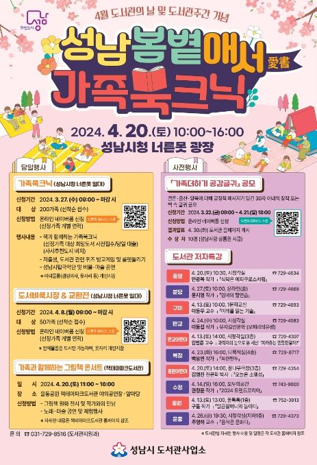 가족 북크닉은 사전 신청을 마친 200가족(713명) 참여한 가운데 오는 4월 20일 오전 10시~오후 4시 성남시청 너른못 광장에서 열린다.