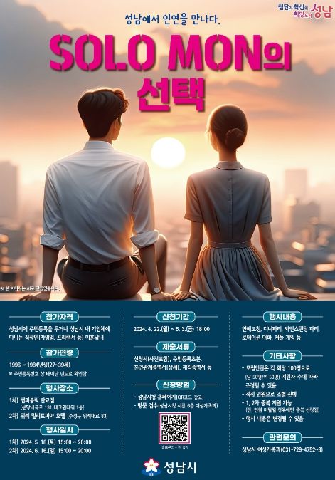 참여하려면 성남시 홈페이지(시민참여→온라인 신청→‘Solo Mon의 선택’ 참가 신청)를 접속해 신청서와 재직증명서, 주민등록초본 등의 증빙서류를 온라인으로 보내면 된다. 성남시청 6층 여성가족과 저출산대책팀을 방문 접수해도 된다.