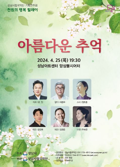 (정도일보) 성남시립국악단은 오는 4월 25일 오후 7시 30분 성남아트센터 앙상블시어터(369석)에서 ‘아름다운 추억’을 주제로 한 연주회를 연다.