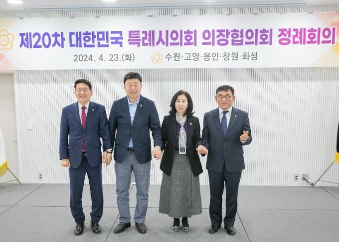 이날 정례회의는 김경희 화성시의회 의장, 김영식 고양특례시의회 의장(특례시의회 의장협의회 회장), 김기정 수원특례시의회 의장, 윤원균 용인특례시의회 의장이 참석했다.