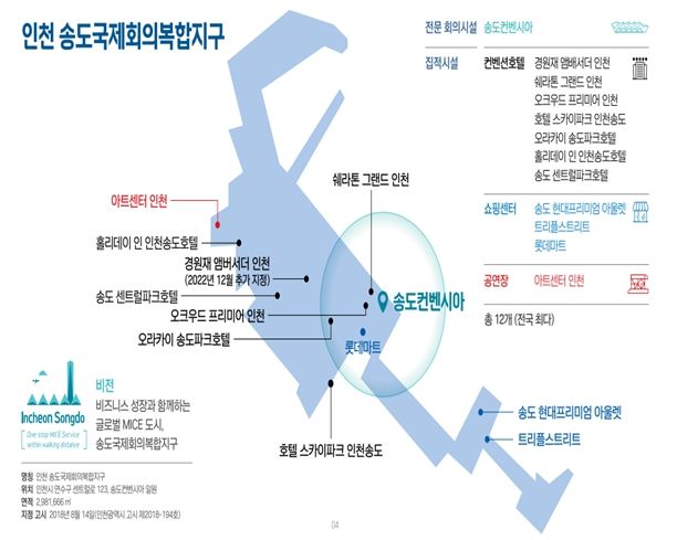 인천시는 올해 총 12억 8천만 원(국비 6억 4천만 원)을 투입해 국제회의복합지구 활성화 지원사업을 추진할 계획이다. 인천시 국제회의복합지구는 2018년 연수구 송도컨벤시아 일원(2.98㎢)이 지정돼 2019년부터 6년 연속 복합지구활성화 지원 사업에 선정됐다.