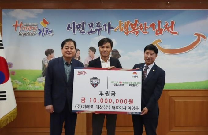 김천상무프로축구단이 23일 김천시청에서 (주)미래로 대산(주)의 후원금 전달식 행사를 진행했다.