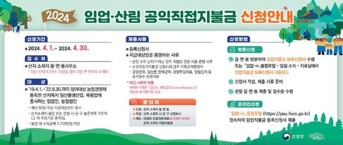 (정도일보) 진주시는 4월 1일부터 시작한‘2024년 임업·산림 공익직접지불금’ 신청·접수를 오는 30일 마감한다.