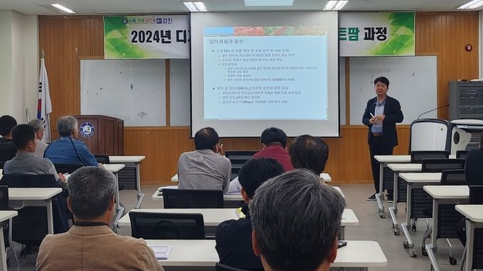 (정도일보) 강진군 농업기술센터가 지난 23일 농업기술센터 소회의실에서 디지털농업대학 시설원예스마트팜과정 수업동안 스마트팜의 기본요건으로 꼽히고 있는 ‘양액 재배’ 를 주제로 교육을 진행했다.