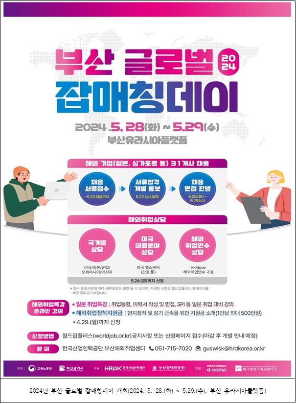 (정도일보) 부산시는 오는 5월 28일부터 5월 29일 2일간 부산유라시아플랫폼에서 '부산 글로벌 잡매칭데이'를 개최한다고 밝혔다.
