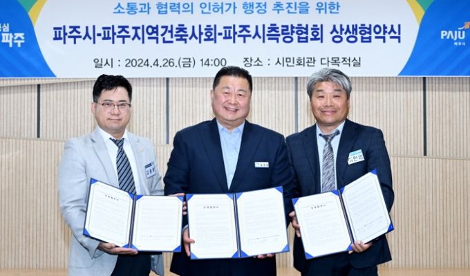 (정도일보) 파주시는 26일 파주지역 건축사회, 파주시 측량협회와 함께 ‘2024 소통과 협력의 인허가 행정 추진을 위한 상생협약식’을 개최했다.