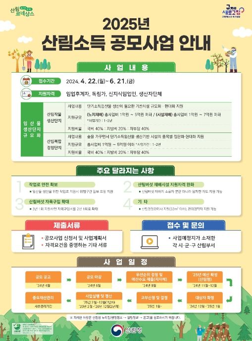 효율적인 임업 경영을 위한 산림소득 공모사업에는 ‘산림작물생산단지 사업’과 ‘복합경영단지 사업’이 있으며, 버섯·산나물·약초류 등 단기소득 임산물을 2년 이상 재배 중인 임업후계자·독림가·신지식임업인·생산자 단체 등을 대상으로 한다. 총사업비 기준 1억 원 이상 7억 원 내에서 신청할 수 있으며, 사업에 선정되면 총사업비의 60%를 지원받는다.