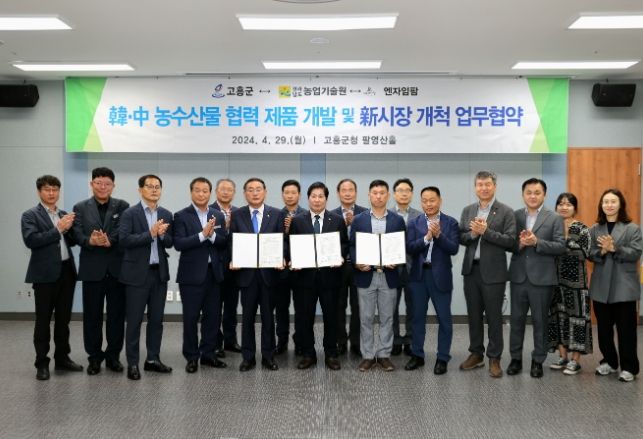 (정도일보) 고흥군은 29일 군청 팔영산홀에서 전라남도농업기술원(원장 박홍재)과 관내 수출업체(엔자임팜 대표 김주호)가 참석한 가운데 韓·中 농수산물 협력 제품 개발 및 新시장 개척 업무협약 체결했다고 밝혔다.