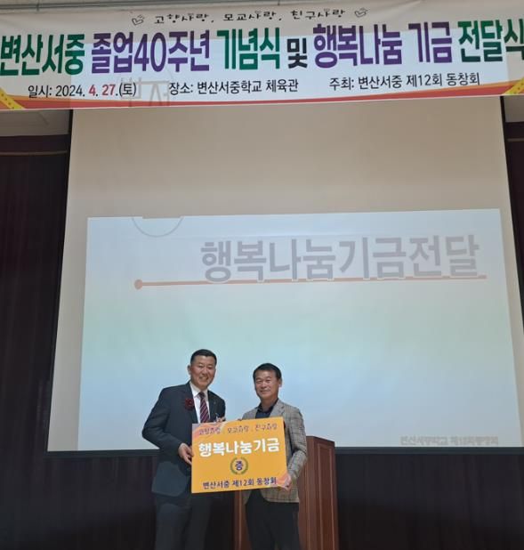(정도일보) 변산면에 위치한 변산서중 제12회 동창회는 지난 27일 졸업40주년을 맞아 행복나눔기금 300만원을 기탁했다.