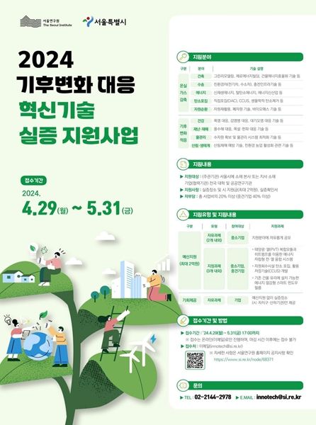 서울시는 4월 29일 ~ 5월 31일 ‘기후변화대응 혁신기술 실증 지원사업’에 참여할 기업을 모집한다고 밝혔다. 시는 사업 내용을 상세히 소개하고 관련 문의를 받기 위해 5월 7일 온라인 설명회를 열고, 5월 10일에는 탄소포집 관련 현장설명회를 개최한다.