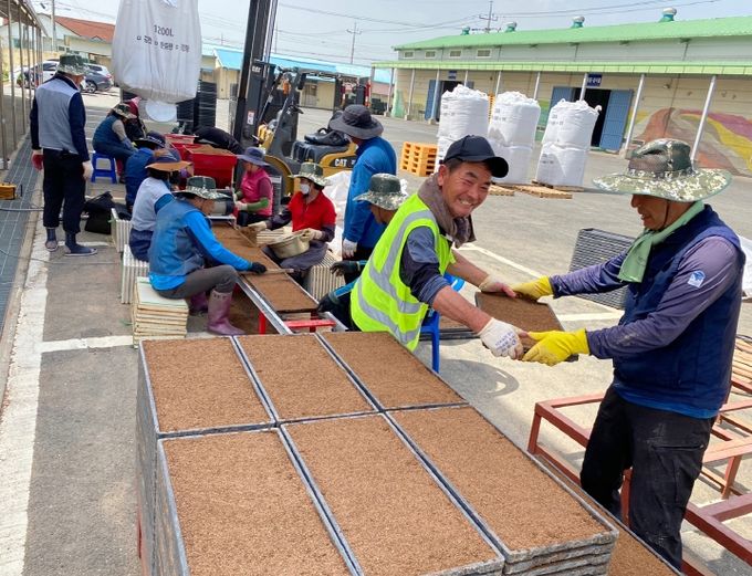 파종작업은 먼저 염수선(소금물 침지)을 통해 충실한 종자를 선별하고 자체 개발한 종자소독법(60℃ 온탕소독, 하루 침종, 48시간 약제소독)을 적용해 키다리병 등 종자 전염 병해충을 방제한 후 실시한다.