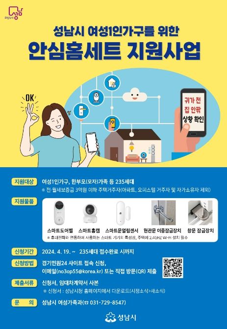 지원 희망자는 성남시 홈페이지(시정소식→새소식) 또는 경기민원24 홈페이지(여성 1인가구 안심패키지 지원사업)를 접속해 신청서와 임대차계약서 사본을 첨부·접수하면 된다.