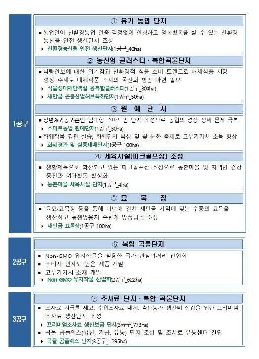 ①Non-GMO 유지작물 산업화(2공구_622ha), ②곡물 콤플렉스 단지(3공구_1,295ha), ③프리미엄조사료 생산보급단지(3공구_773ha), ④스마트농업 원예단지(1공구_30ha), ⑤식물성대체단백질 융복합클러스터(1공구_300ha), ⑥화훼경관 및 실증재배단지(1공구_100ha), ⑦친환경농산물 안전 생산단지(1공구_40ha), ⑧농촌마을 체육시설(파크골프장)(1공구_4ha), ⑨새만금 묘목장(1공구_100ha), ⑩새만금 곤충산업허브특화단지(1공구_50ha)가 그것이다.