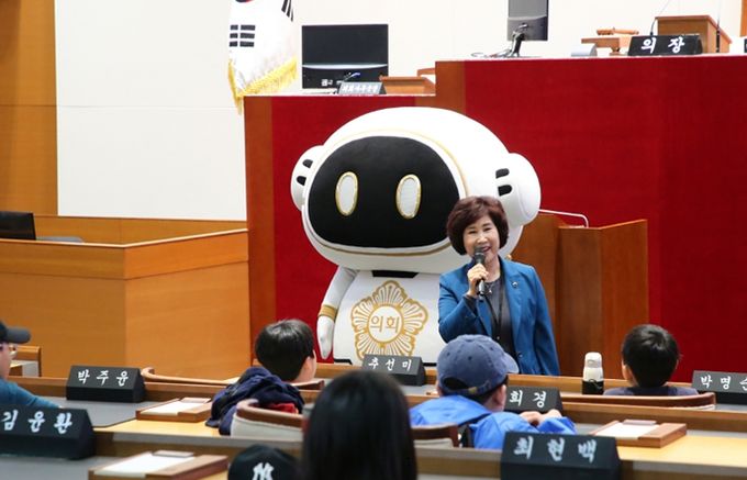 이어서 방문한 본회의장에서는 본회의가 진행되는 의원석에 앉아 본회의장의 각종 시설물과 회의 진행 과정에 대해 알아본 후, 실제 회의가 진행되는 영상을 시청하며 안건이 처리되는 과정을 상세히 배웠다. 또한 직접 의사봉을 두드려 보는 ‘의사봉 3타 체험’을 하고, 성남시의회 SNS 캐릭터 ‘이로운’과 함께 기념사진을 촬영하며 견학을 마쳤다.