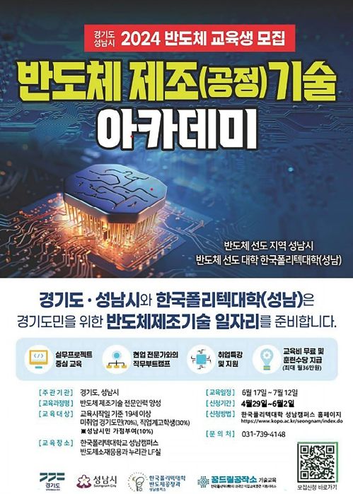 (정도일보) 성남시는 반도체 전문 인력양성을 위해 ‘2024년 반도체 제조기술 아카데미’ 교육생 20명을 오는 6월 2일까지 모집한다.