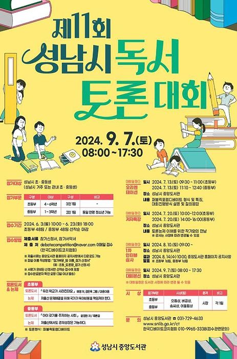 오리엔테이션(7.13), 저자 특강(7.20) 참여 뒤 인터뷰 심사(8.10)를 통과하는 32개 팀(초·중등 각 16개 팀)이 오는 9월 7일 분당구 야탑동 중앙도서관에서 열리는 성남시 독서토론대회 본선과 결승을 치른다.