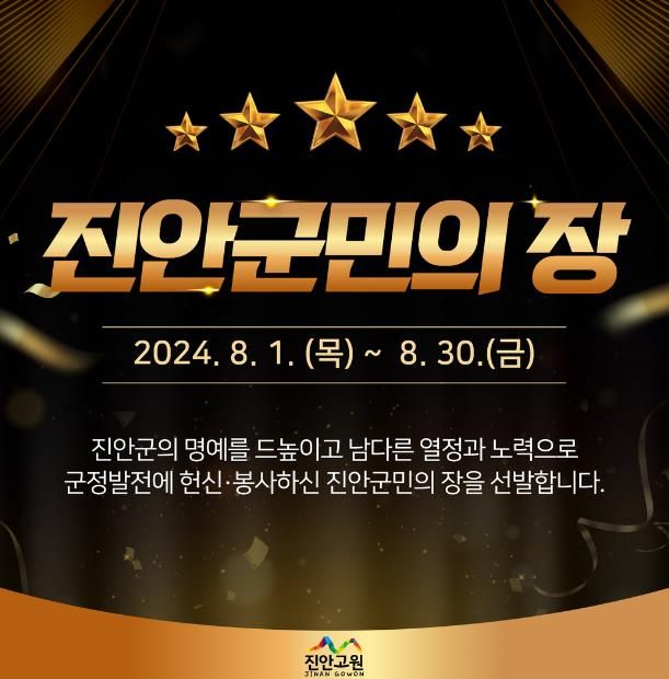 (정도일보) 진안군은 진안군의 명예와 자긍심을 드높이고 지역사회 발전에 헌신·봉사한 2024년 진안군민의 장 수상 후보자를 추천받는다고 1일 밝혔다.