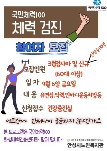 (정도일보) 안성시노인복지관은 국민체력100 화성체력인증센터와 함께 ‘국민체력 100 체력검진’ 참여자를 모집한다고 23일 밝혔다.