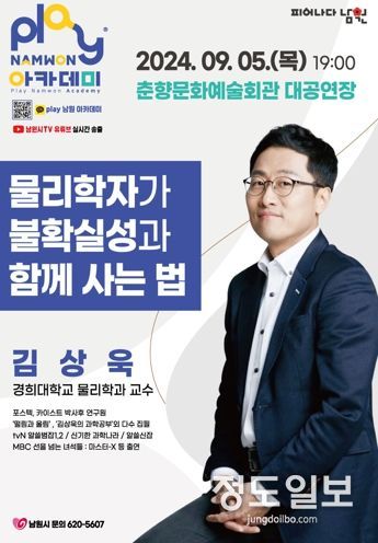 (정도일보) 남원시는 9월 5일 오후 7시, 춘향문화예술회관 대공연장에서 경희대학교 물리학과 김상욱 교수를 초청하여 “물리학자가 불확실성과 함께 사는 법”이라는 주제로 9월 Play남원 아카데미를 개최한다.