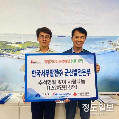 (정도일보) 한국서부발전㈜ 군산발전본부가 지난 6일, 추석 명절을 맞아발전소 주변에 거주하는 저소득 가구와 사회복지시설을 위해 1,520만원 상당의 온누리상품권과 건강음료, 생필품꾸러미를 구입해 군산시에 전달했다.