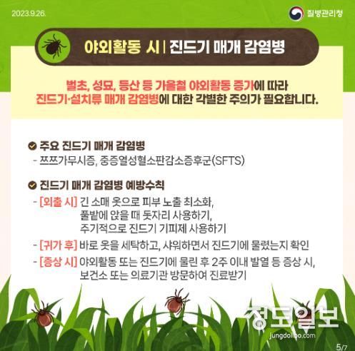 특히 야외활동 증가로 진드기매개감염병(쯔쯔가무시증, 중증열성혈소한감소증후군)을 예방하기 위해서는 진드기에 물리지 않도록 야외활동 시 긴소매, 긴바지 등 착용, 기피제 주기적 사용, 귀가 후 바로 옷 세탁, 샤워하면서 몸에 진드기 붙어 있는지 확인하는 등 예방수칙을 반드시 지켜야 한다.,