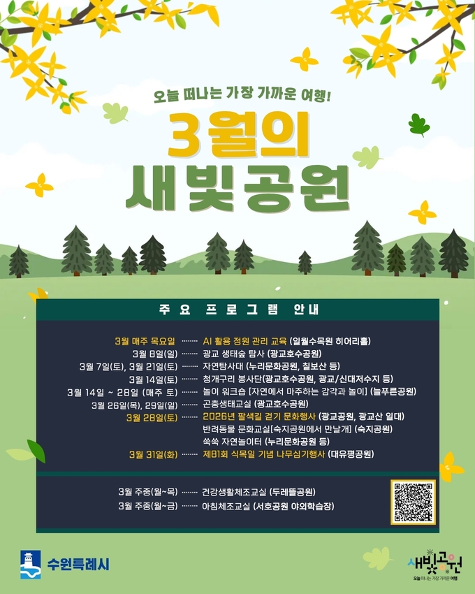 [정도일보 고정희 기자] 수원특례시는 3월 한 달간 도시공원에서 다채로운 시민 참여형 봄맞이 프로그램을 운영한다. 생태·문화·체육 활동을 확대해 공원을 일상 속 체험과 여가의 공간으로 활용할 계획이다.