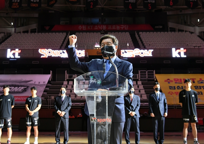 염태영 시장은 “오늘은 20년 만에 수원에서 프로농구가 부활한 역사적인 날”이라며 “‘대한민국 프로스포츠의 중심’인 수원시에 새 둥지를 튼 수원 KT 소닉붐 선수들과 코치진 여러분을 환영한다”고 말했다.