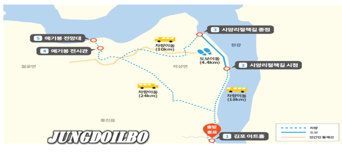 먼저 ‘김포’ 구간은 총 47㎞로, 시암리철책길, 애기봉평화생태공원 등의 코스로 이뤄져 있으며, 특히 지난달 7일 개장한 애기봉 평화생태공원 전망대에서는 북한 개풍군 선전마을과 송악산 관망이 가능하다.