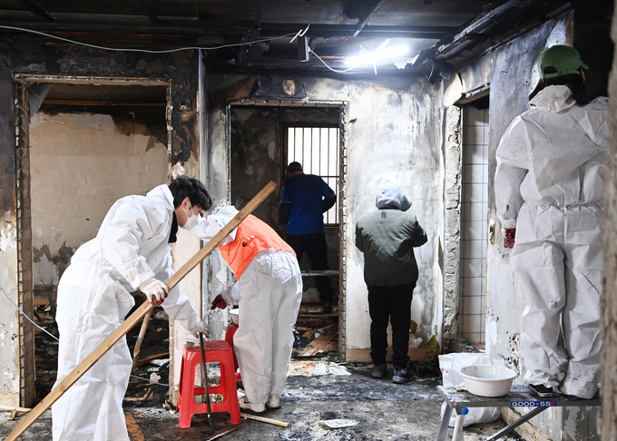 불이 난지 1주일만인 1월 8일, (사)함께웃는세상 봉사자 10여 명이 이른 아침부터 전씨 가족의 집을 찾아 타고 남은 잔해를 정리하는 작업을 했다. 추후에 다시 전씨 집을 찾아 도배를 하고, 장판을 시공할 예정이다.